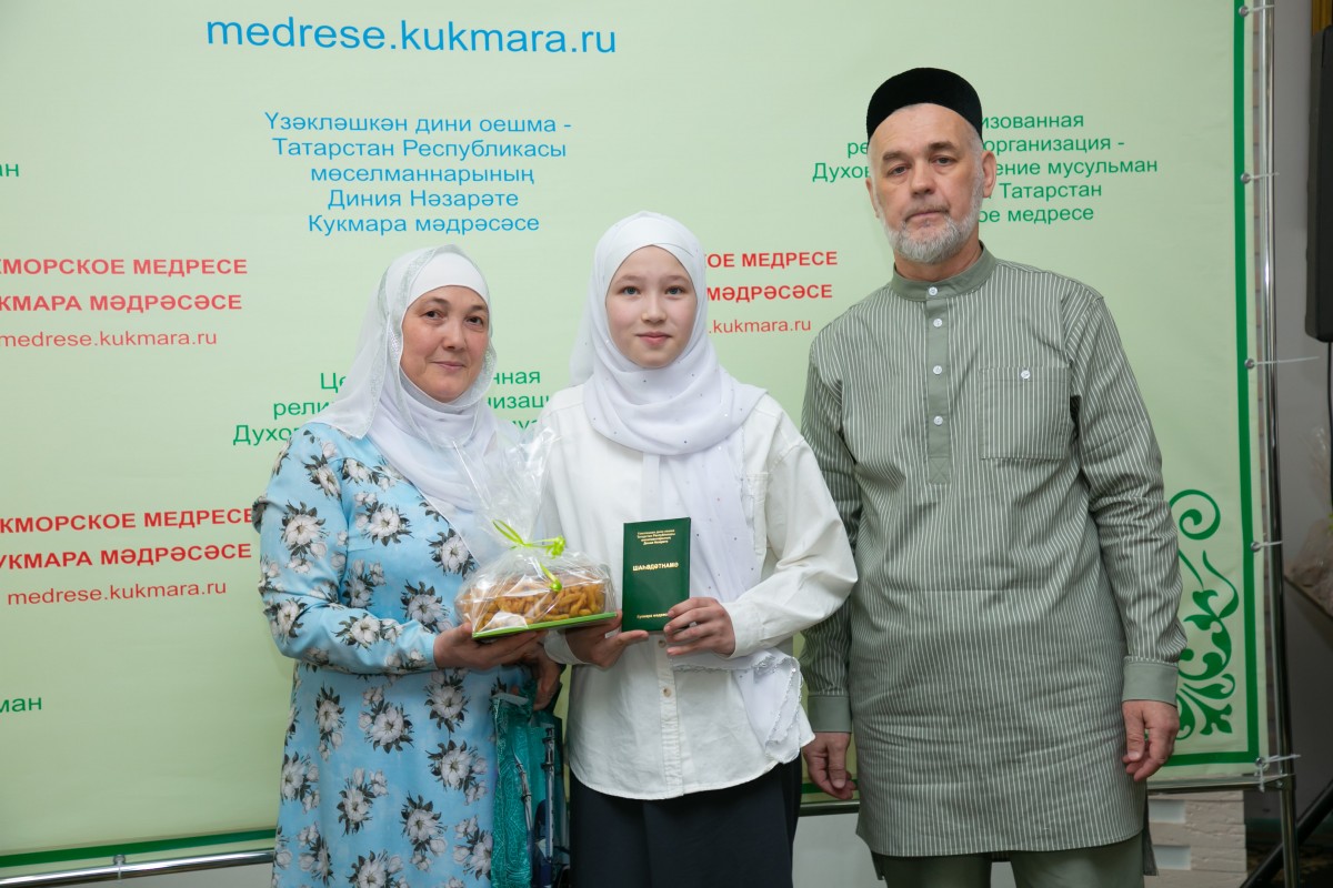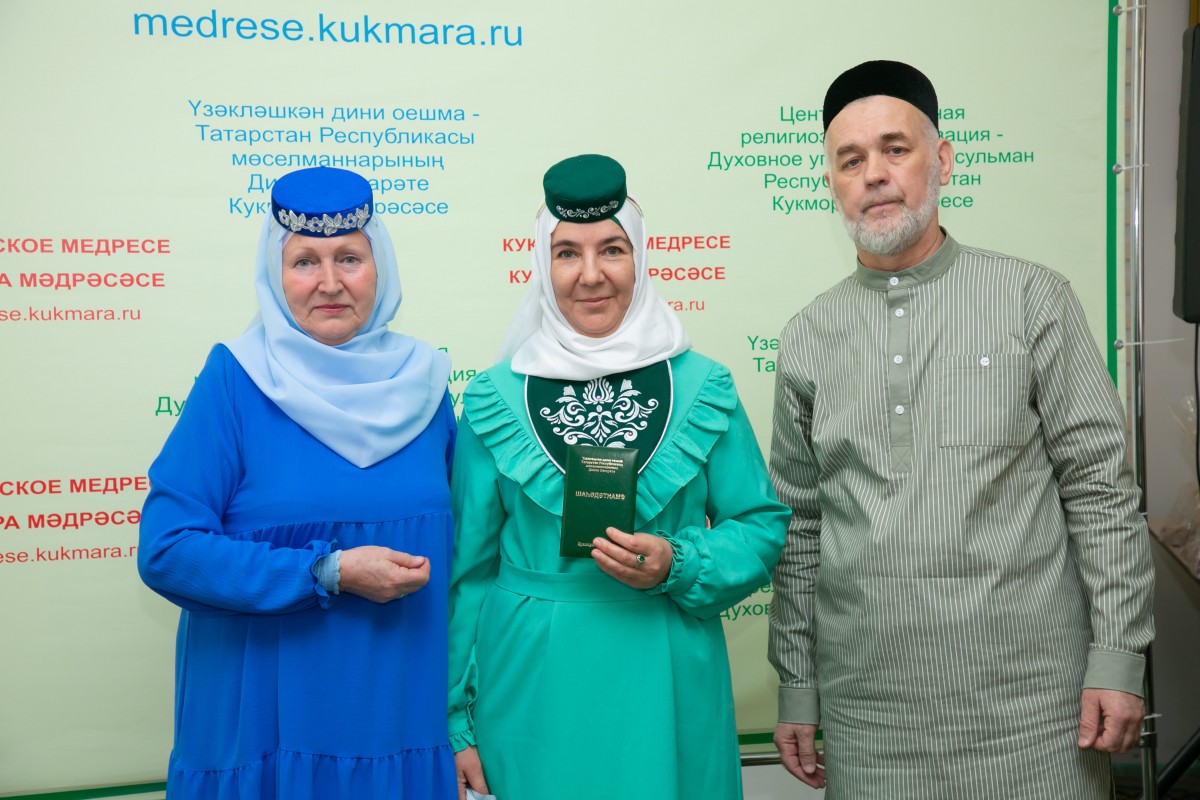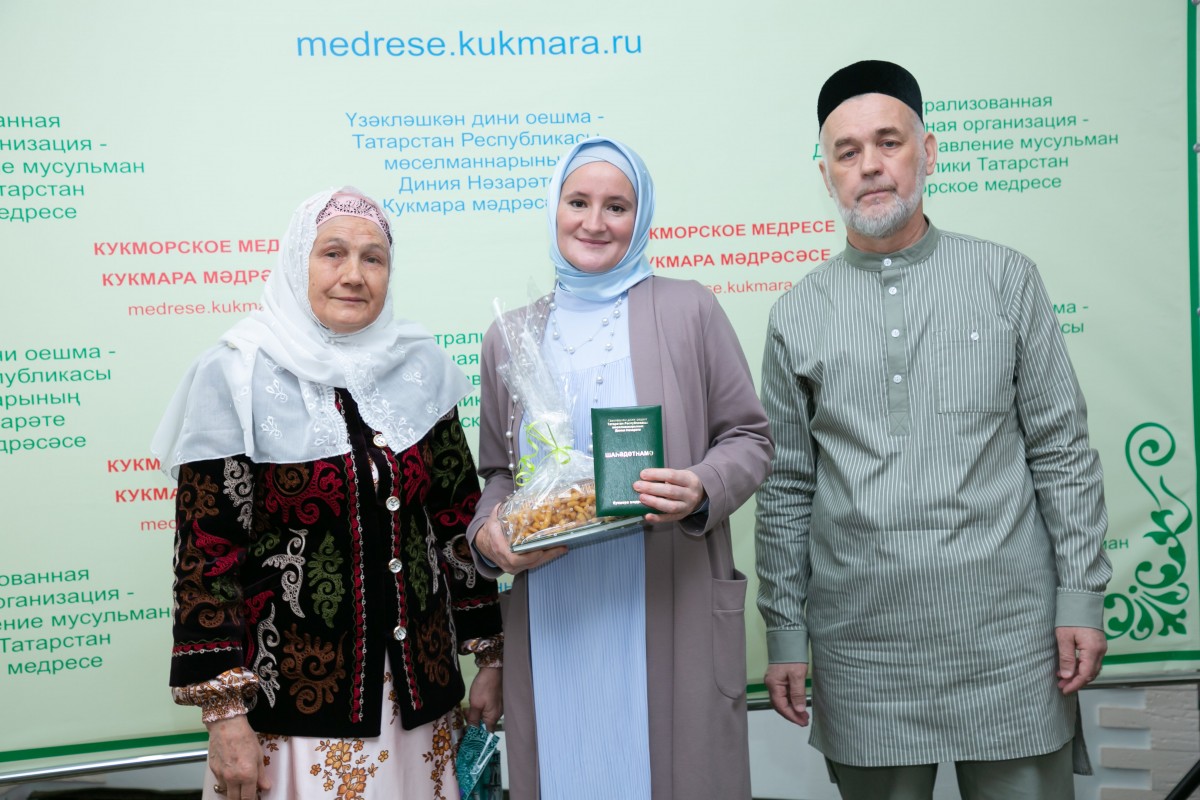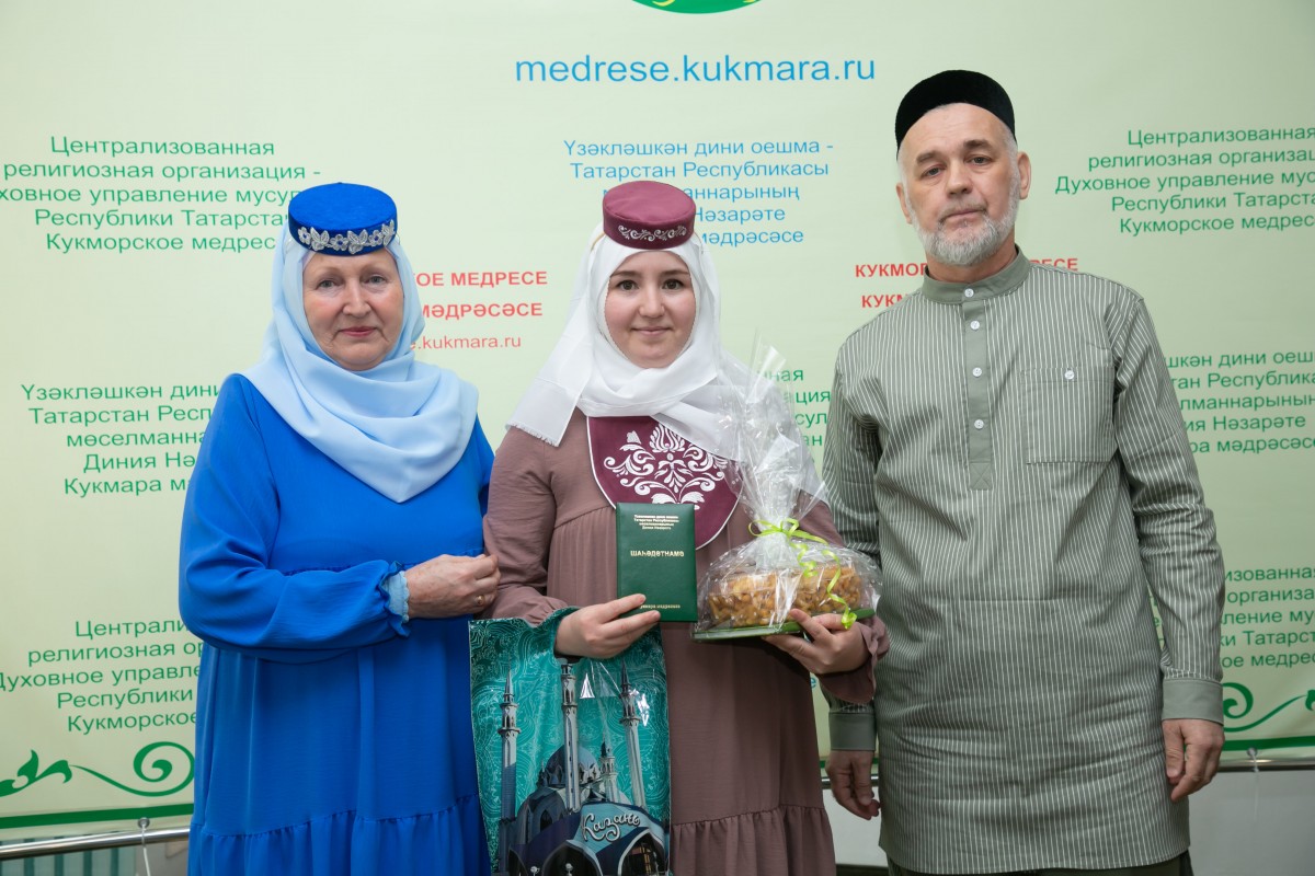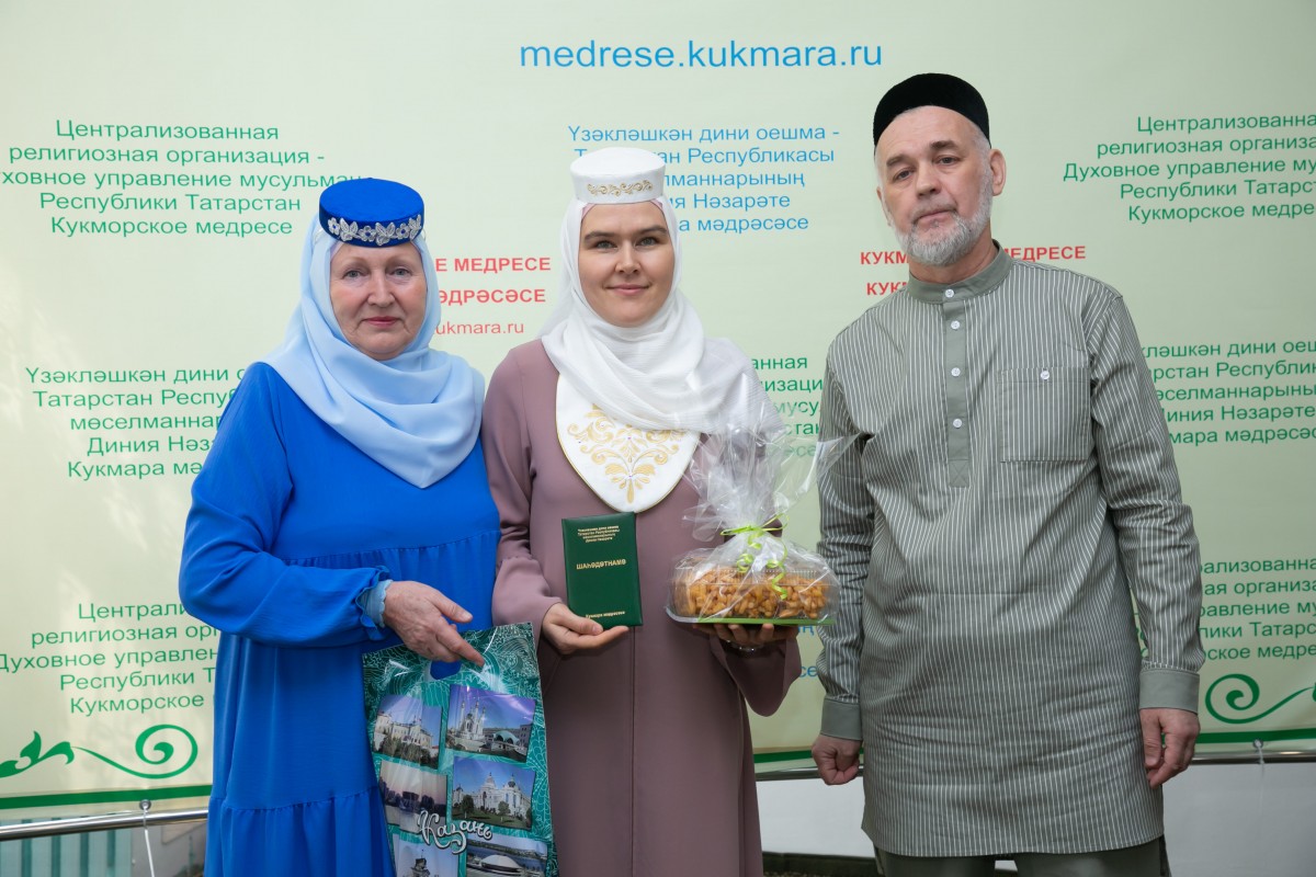 В Кукморском медресе учатся люди разных возрастов: это и молодежь, и дети, и взрослые. По ежегодной доброй традиции среди нынешних выпускников были отмечены самые старшие. Ими стали 68 - летний Шәфигуллин Марсель Бариевич и 71-летняя Зигашина Зумара Нихатовна. Обоим были вручены памятные подарки.